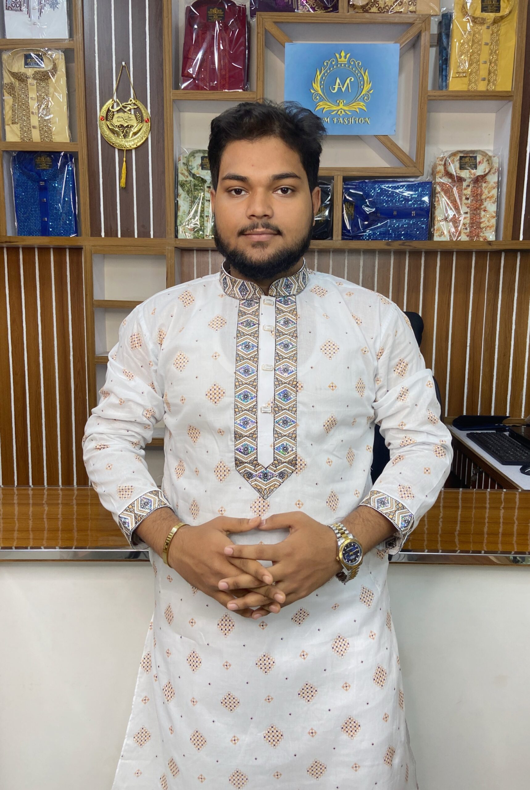 ✅ কাপড়ের মান: প্রিমিয়াম ধুতি কাপড়, সিকোয়েন্স এম্বটারি কাজ করা।