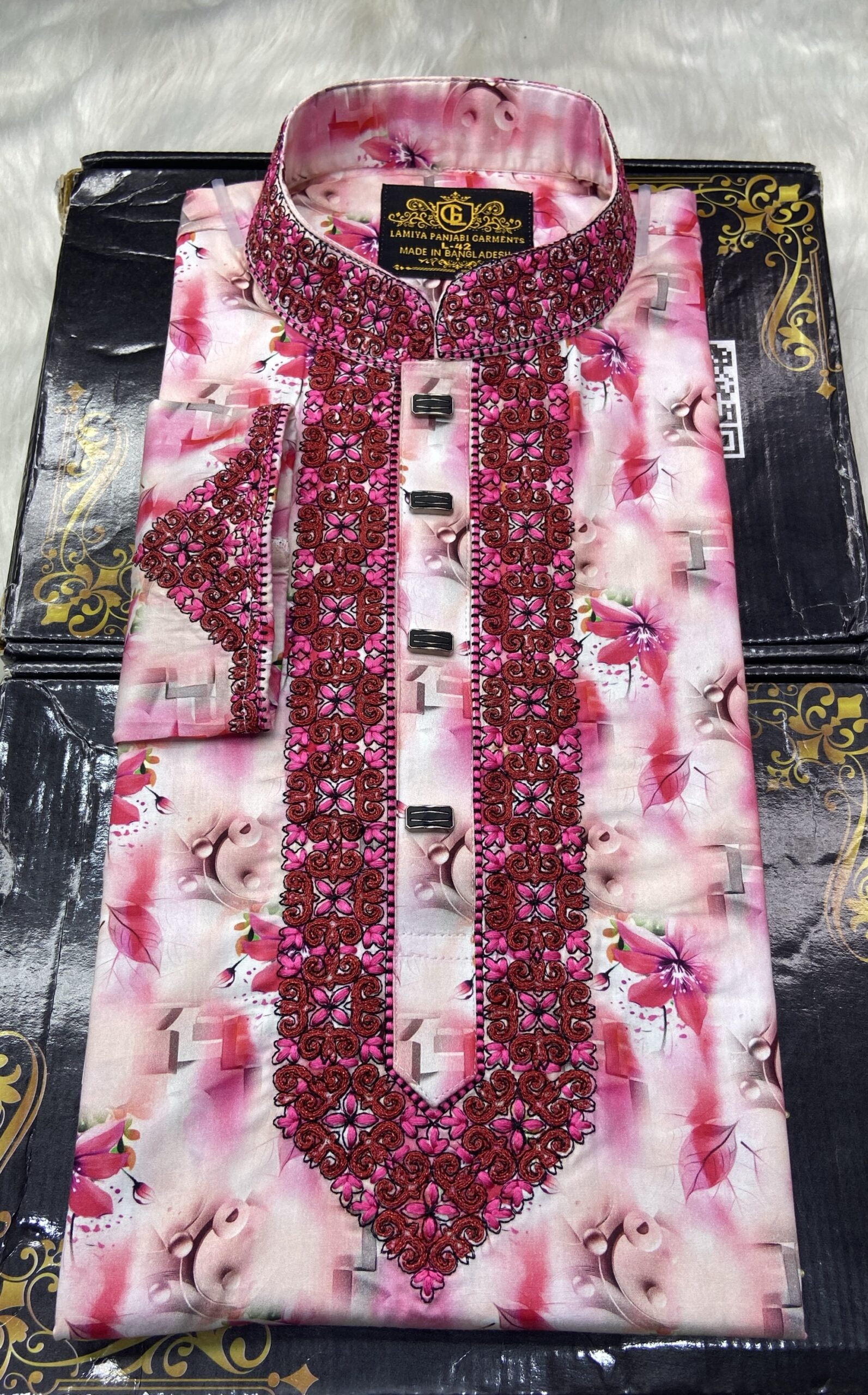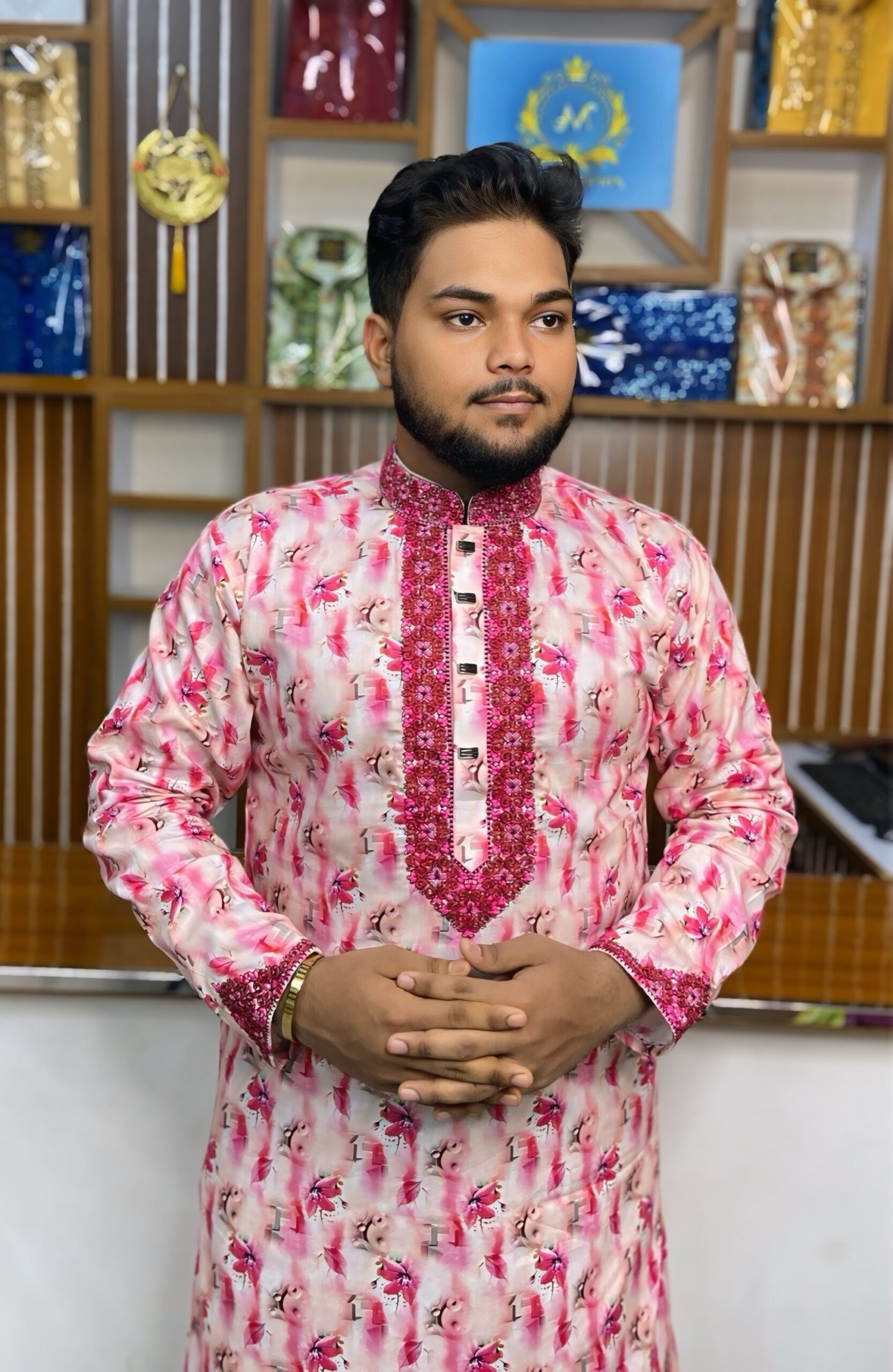 ✅গোলাপি কালার প্রিন্ট এমব্রয়ডারি পাঞ্জাবি – কোড: LM-903